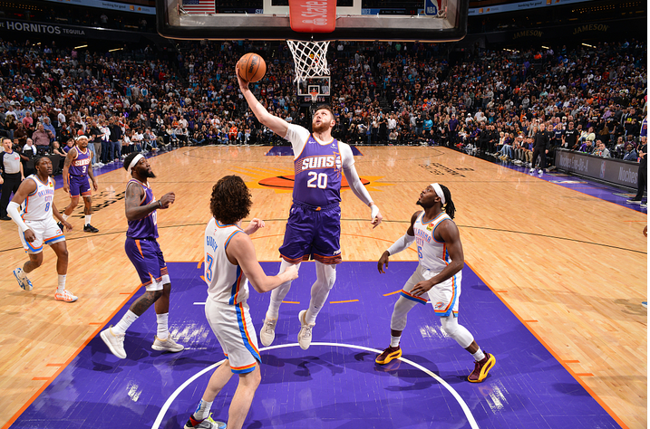 菲尼克斯太阳队的优素福·尤尔基奇在对阵俄克拉荷马城雷霆队的比赛中抢下篮板。