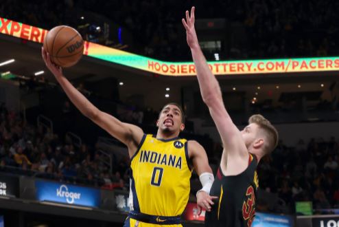 印第安纳步行者队的泰瑞斯·哈利伯顿(#0)在对阵克利夫兰骑士队的比赛中冲向篮筐